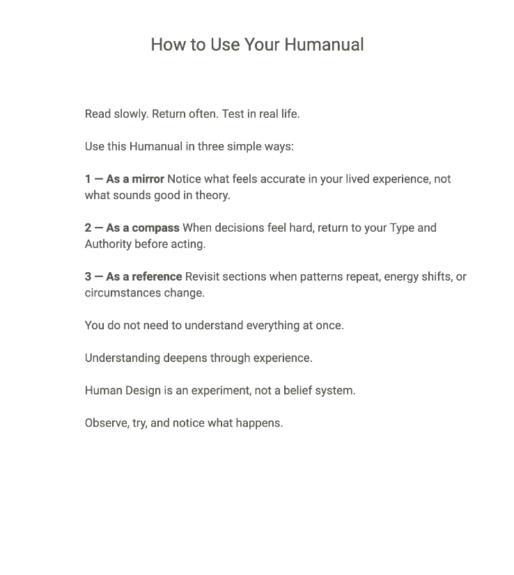 This Humanual translates your unique Human Design into clear, usable insight you can return to again and again.